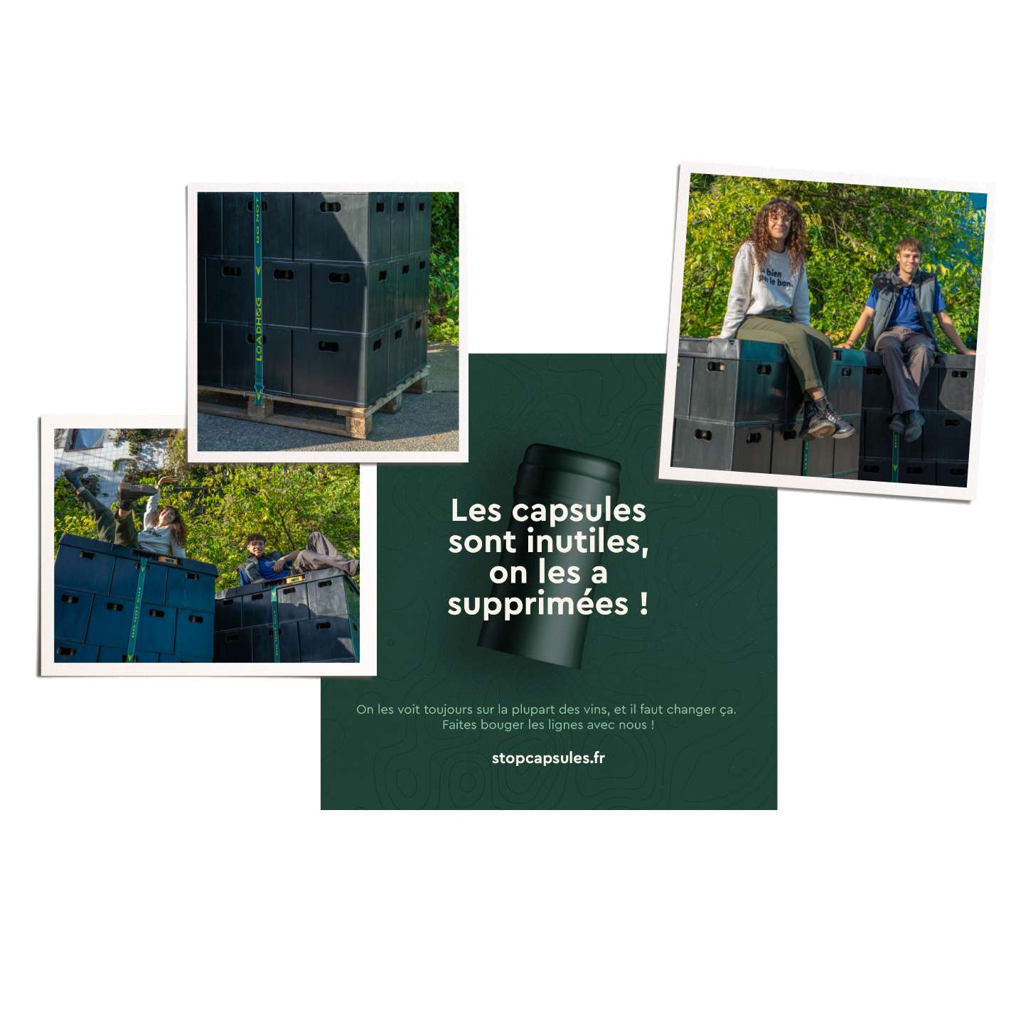 Supprimer les capsules : La capsule, c’est 3g de déchet. Insignifiant, sauf quand on le rapporte au marché du vin qui représente dans le monde plus de 33 milliards de bouteilles vendues en 2022. En supprimant la capsule, on contribue à éviter la production de 70 000 tonnes de déchets. Vous vous doutez qu’on a hâte de voir une loi passer sur le sujet pour l’interdire à terme.